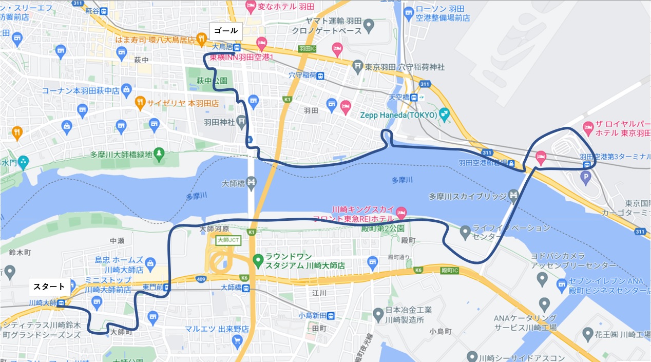 | 川崎大師駅(10:00)…川崎大師…多摩川緑地(多摩川)…多摩川スカイブリッジ…